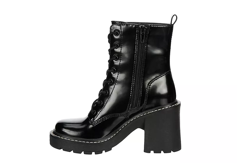 Take your look to the next level with the Lion women’s lace-up boot by Madden Girl. This fashionable combat-style boot features a faux leather upper with a lace-up front, an inside zipper, and a heel pull tab for a secure, comfortable fit. A padded insole cushions your feet, while the chunky 3½” block heel adds a dramatic lift, and the durable lugged outsole provides excellent traction and stability.